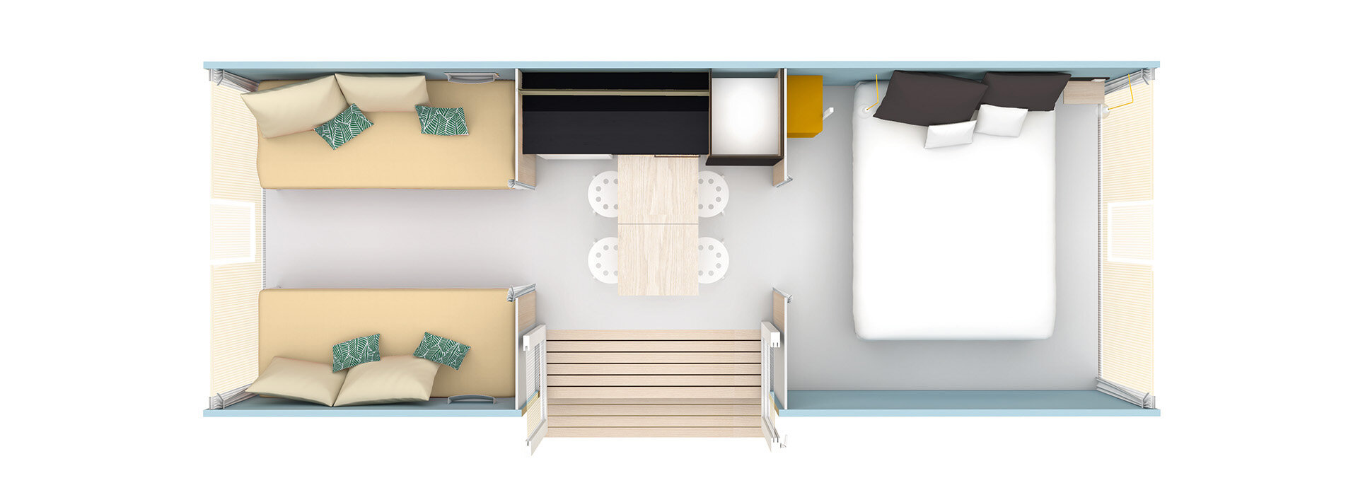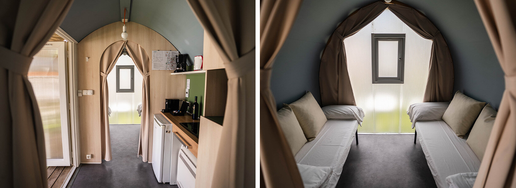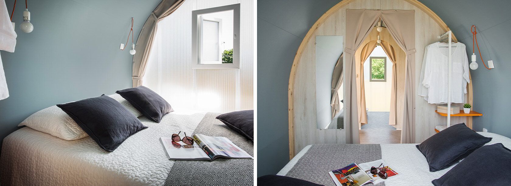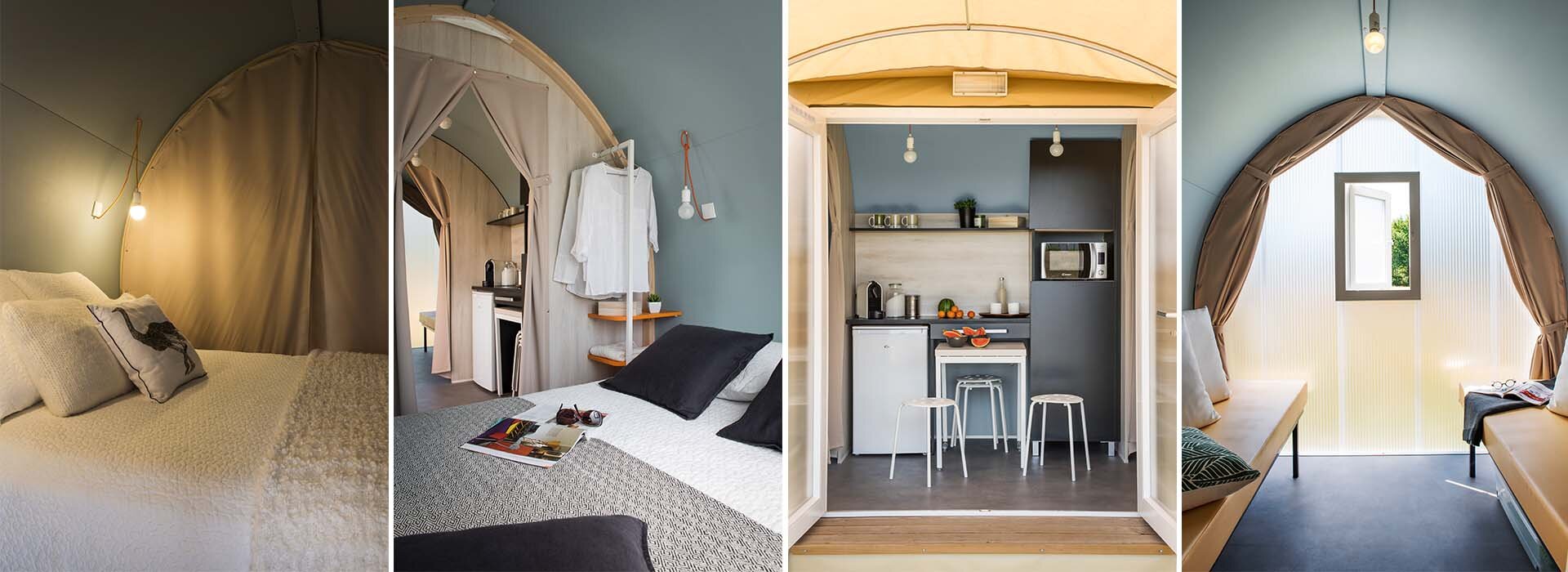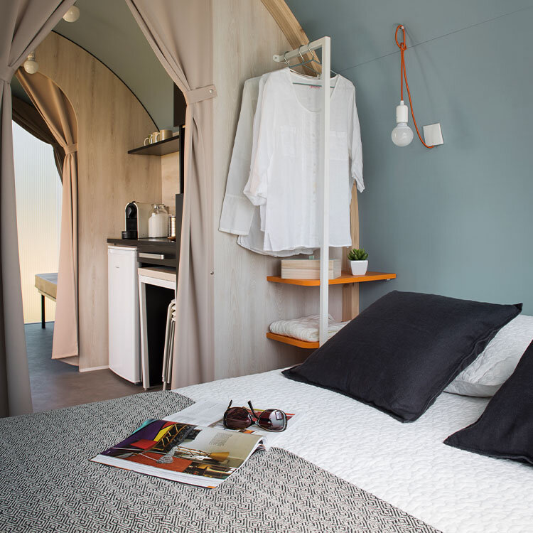 Kokozelt ist unser neues Zelt mit starrer Fläche mit futuristischem Design: Sie können das ganze Abenteuer des Campings erleben, ohne Ihre eigene Ausrüstung mitbringen zu müssen. Das Wohnzimmer mit Kochecke befindet sich in der Mitte zwischen dem Schlafzimmer mit Doppelbett und dem Wohnbereich. Das Netzteil, die Bodenisolierung und die beiden Seitenwände aus Glasfaser erhöhen den Komfort. Etwa 50 Meter entfernt befinden sich Toiletten und Duschen.